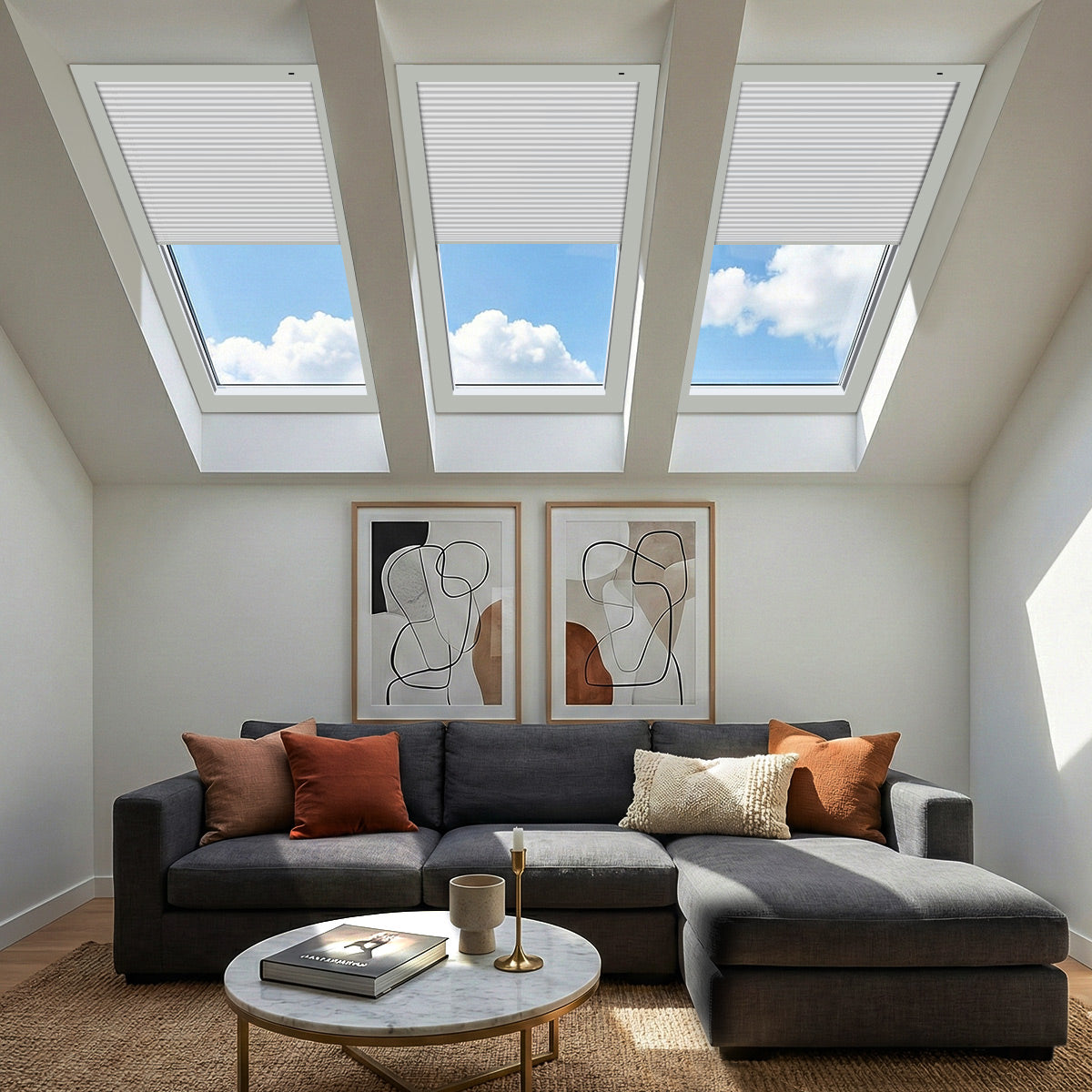 The blackout fabric reduces glare and UV exposure while still allowing natural light to pass through, making these skylight cellular shades perfect for living rooms, kitchens, lofts, home offices, and common areas. They help maintain a pleasant level of brightness without fully darkening the room.