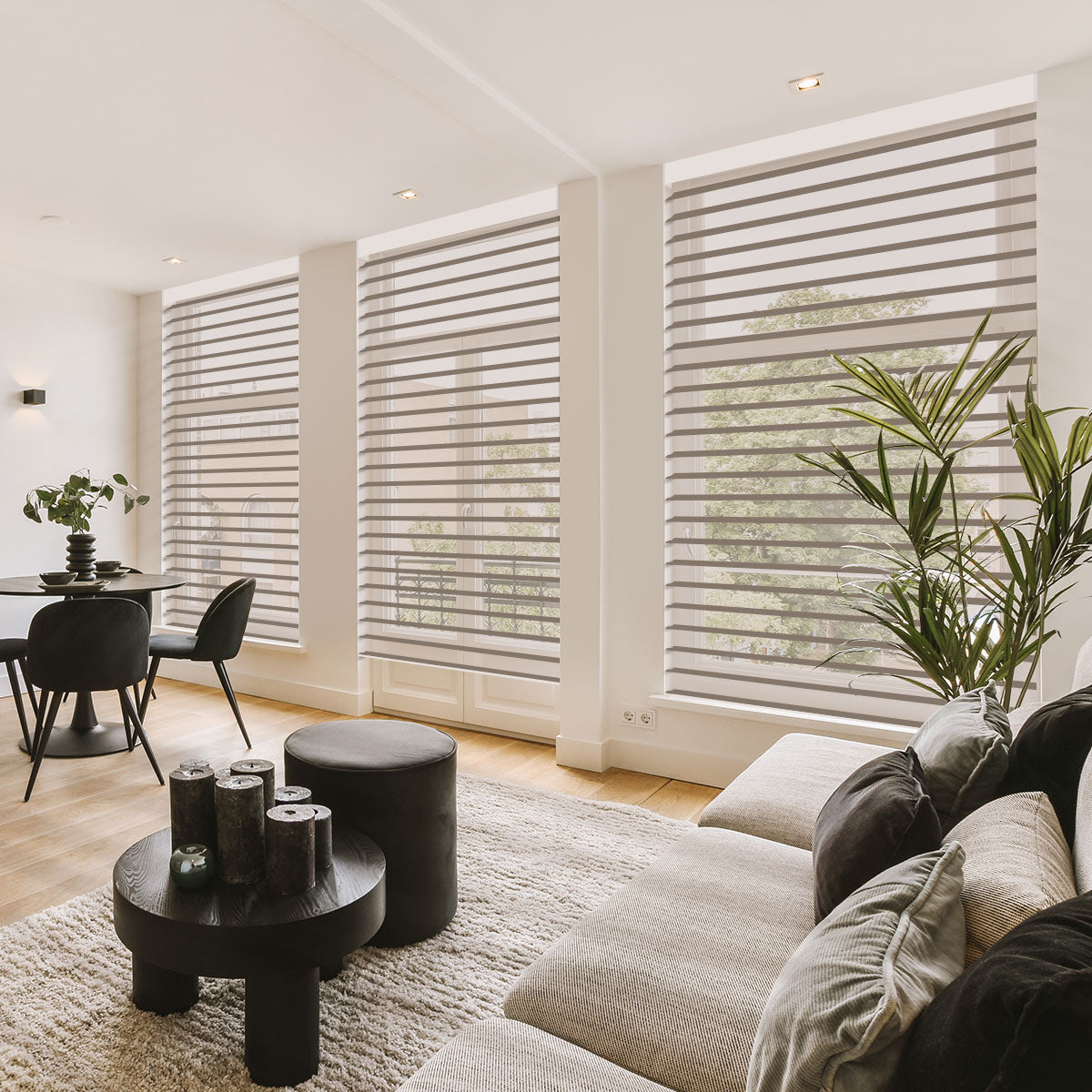 Sheer shades, also known as Shangri-La shades or Silhouette-style shades, combine the softness of sheer fabric with the versatility of horizontal vanes. Their unique design lets you tilt the vanes between two layers of sheer fabric, giving you precise control over light and privacy.