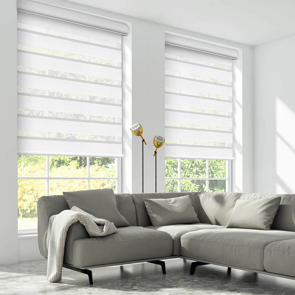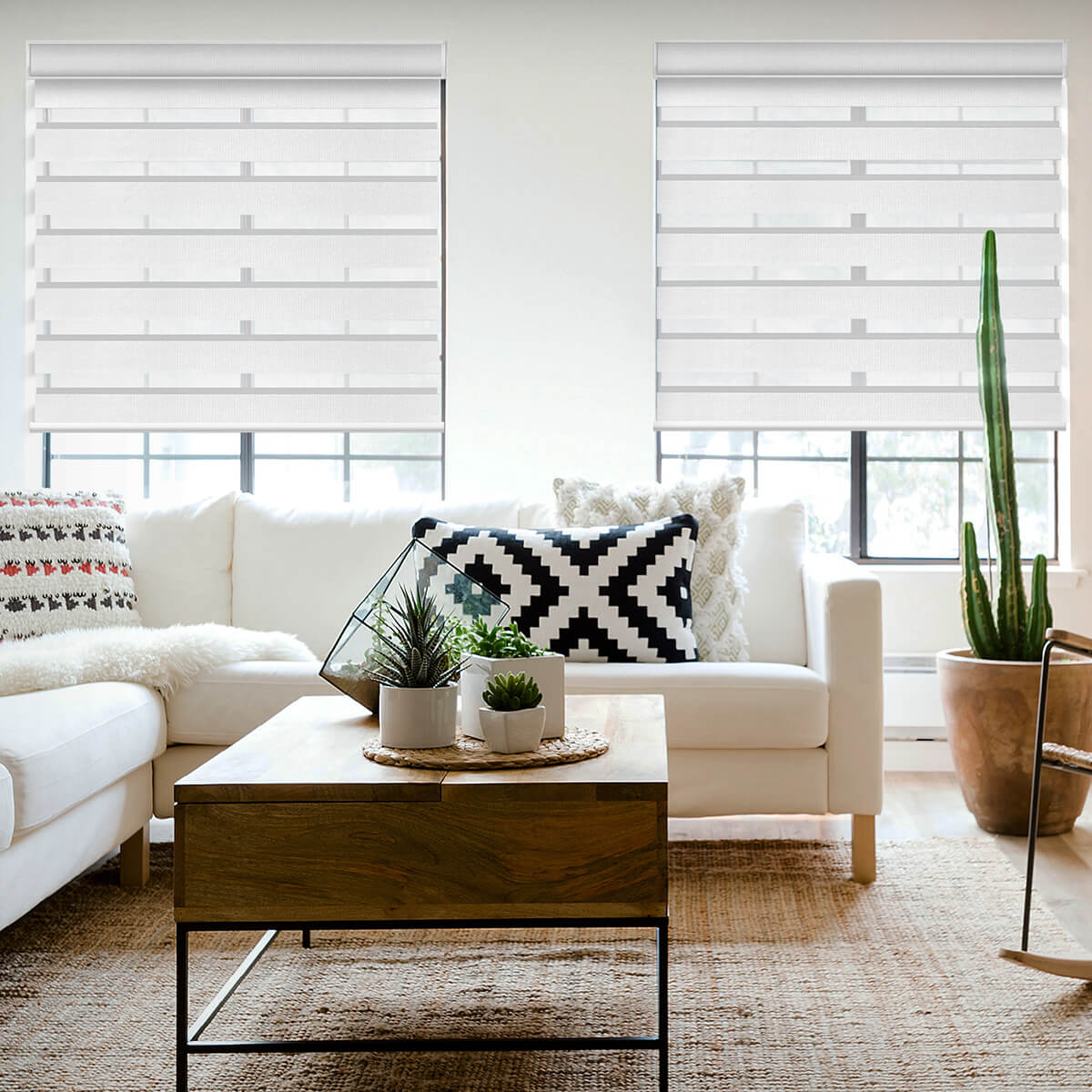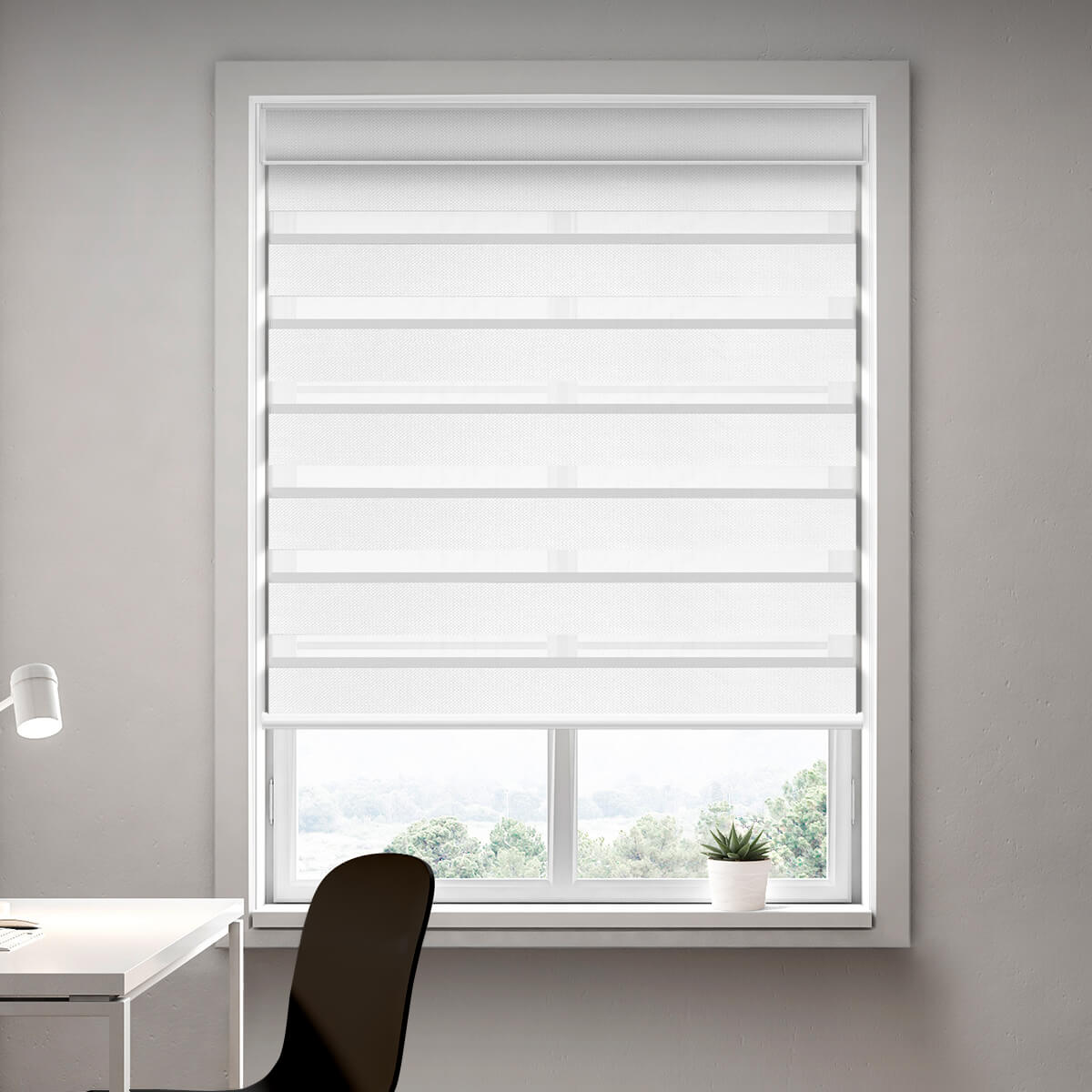 Our shades use two overlapping layers of fabric—sheer and opaque. By aligning the sheer with opaque bands, you control how much light enters and how much outside view is visible. When the opaque sections fully overlap, you enjoy full privacy and near-darkness.