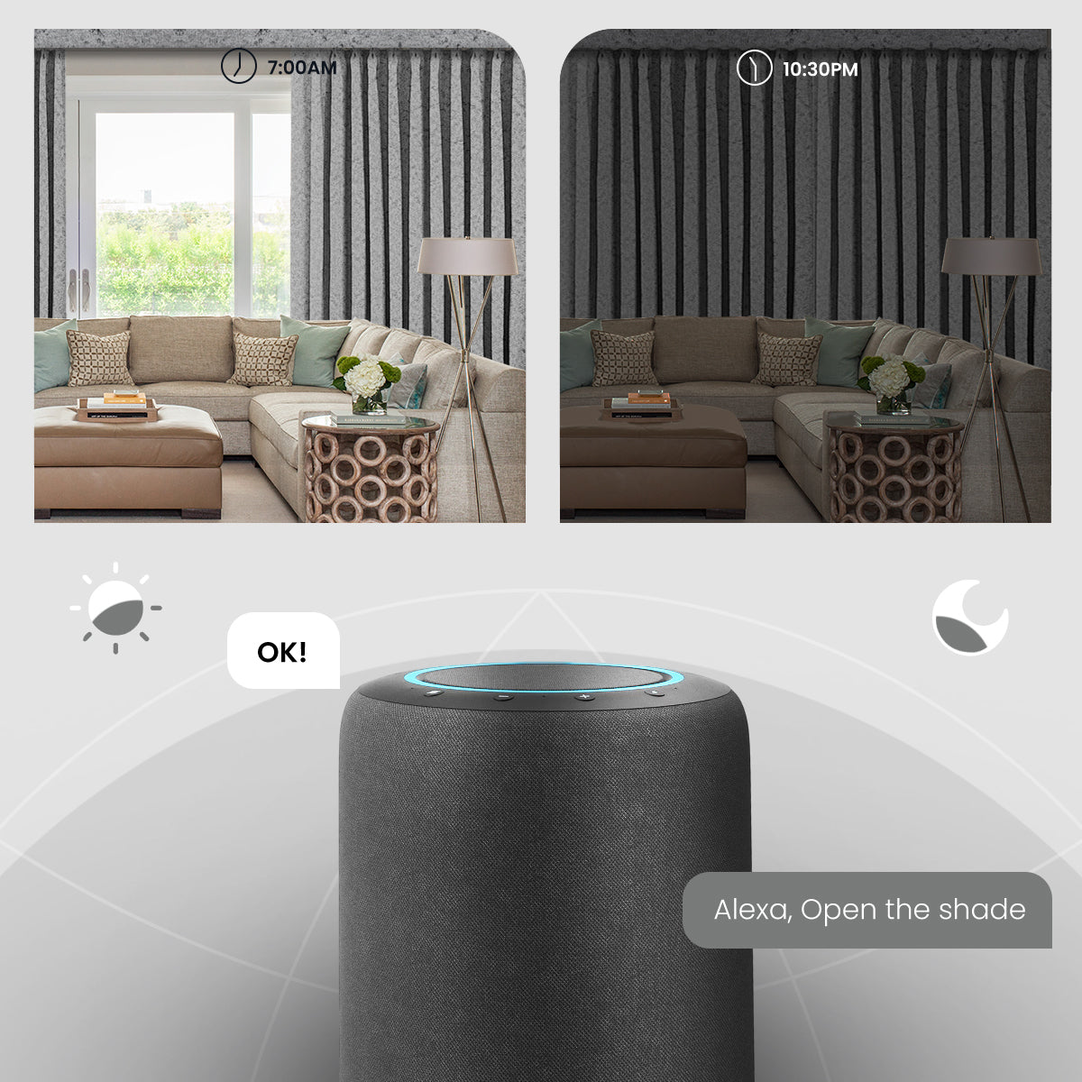 ✔ With just a tap, lower the shades while you relax on the couch, or raise them automatically at sunrise.