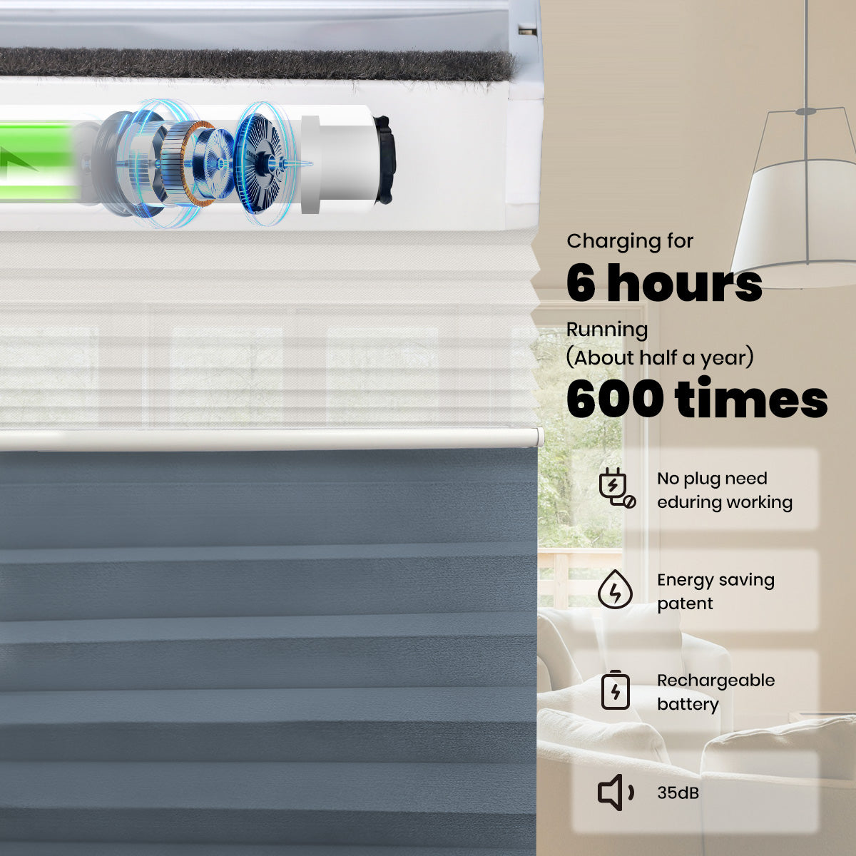 Built-in lithium battery ensures long-lasting performance, typically requiring charging only every 4–6 months. Optional solar panel keeps your shades powered continuously.