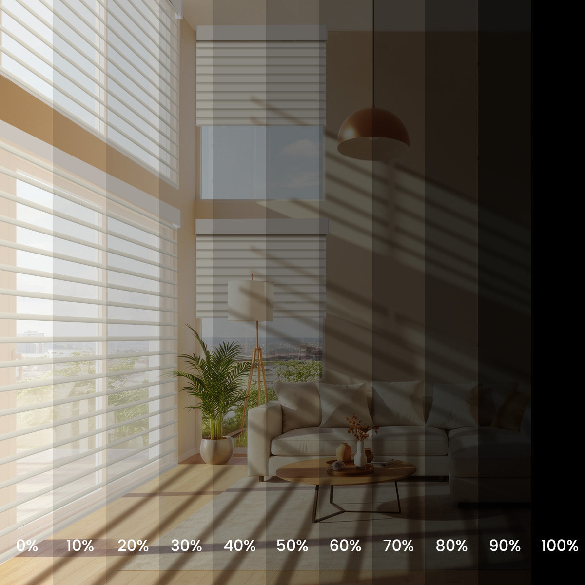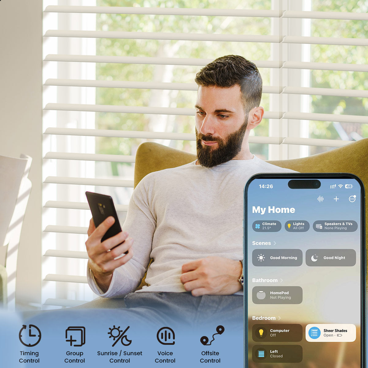 ✔ With just a tap, lower the shades while you relax on the couch, or raise them automatically at sunrise.