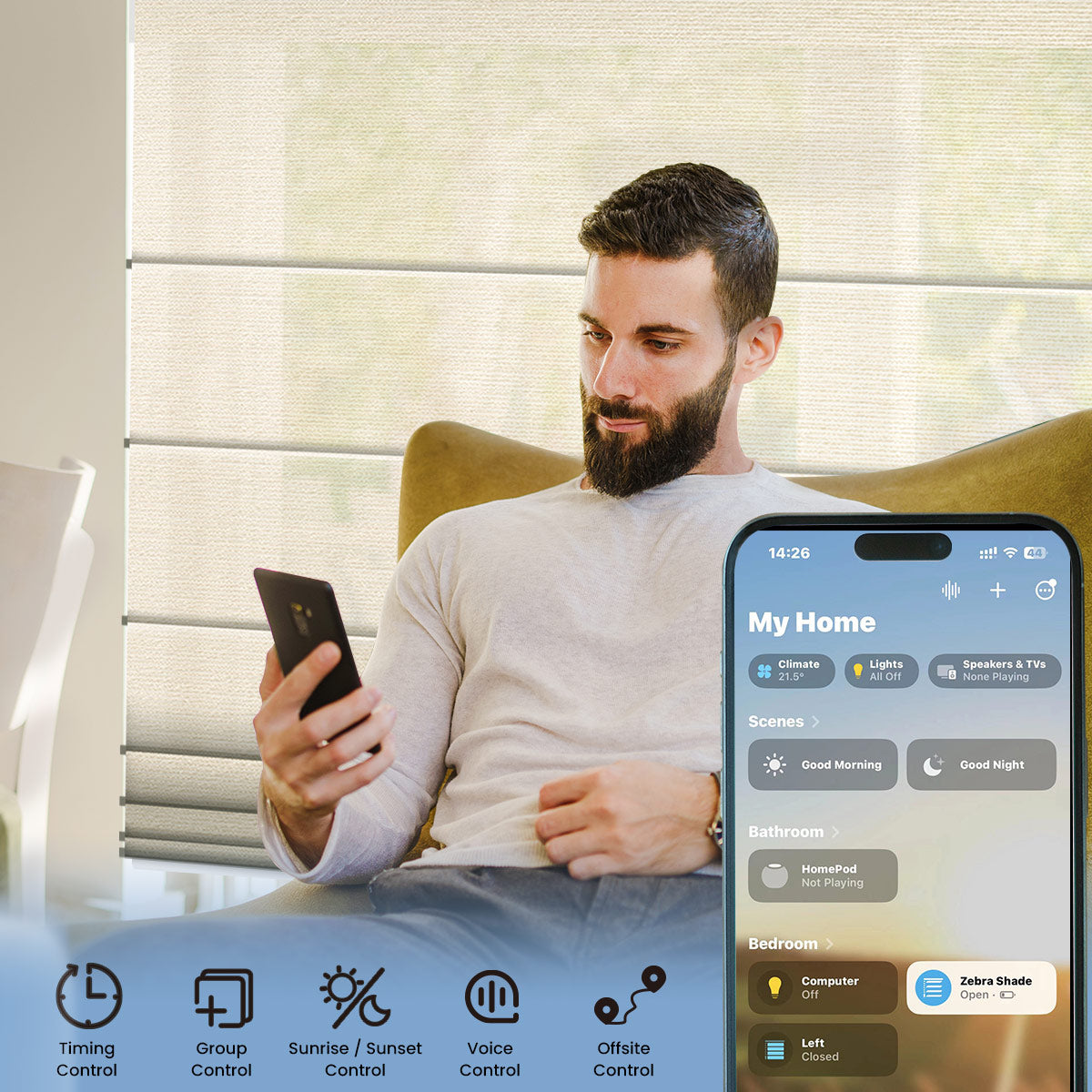 ✔ With just a tap, lower the shades while you relax on the couch, or raise them automatically at sunrise.