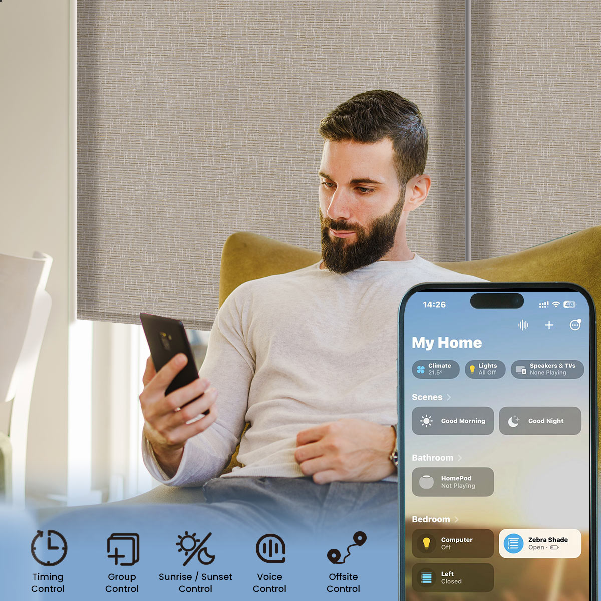 ✔ With just a tap, lower the shades while you relax on the couch, or raise them automatically at sunrise.