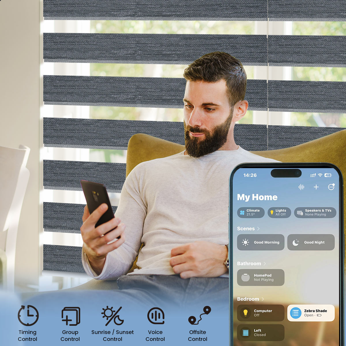 ✔ With just a tap, lower the shades while you relax on the couch, or raise them automatically at sunrise.